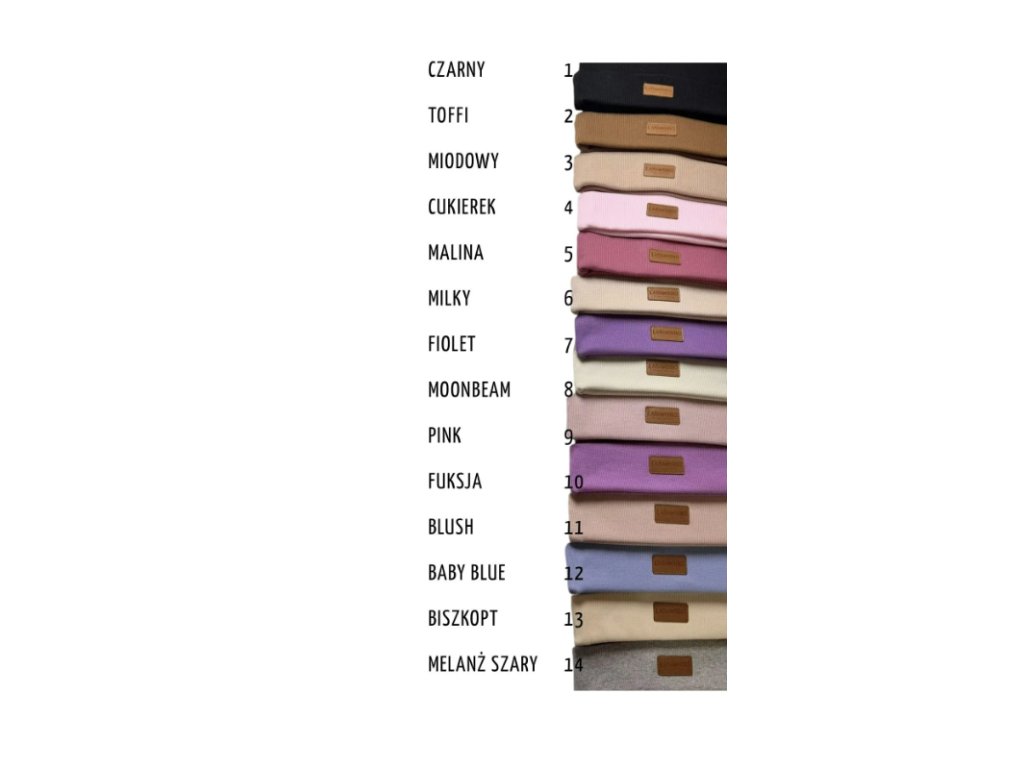 Barvy odshora: černá, karamelová, medová, bonbónová, malinová, mléčná, fialová, měsíční paprsek, růžová, fuchsiová, růžová, světle modrá, piškotová, šedá melanž