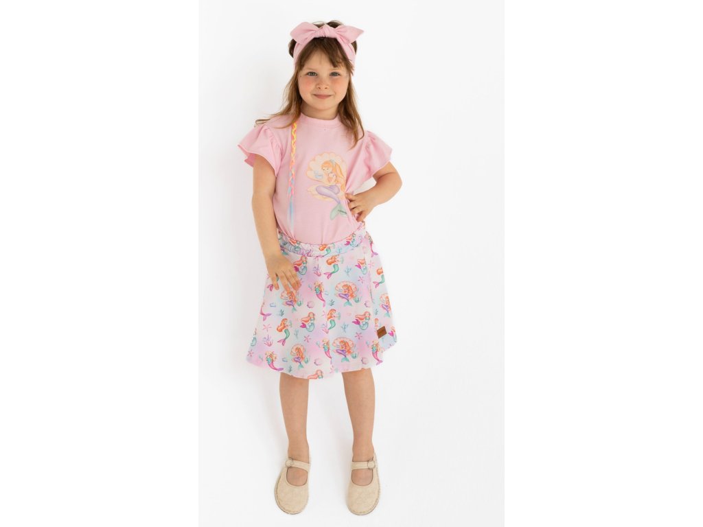 K tomu ladí krátká sukýnka ve střihu „kraťaso-sukně“ s celoplošným barevným motivem mořských panen, mušlí a mořských hvězdic.