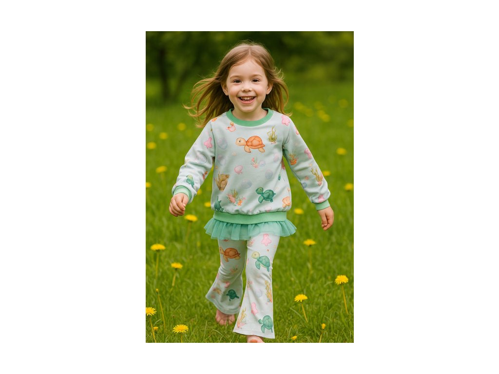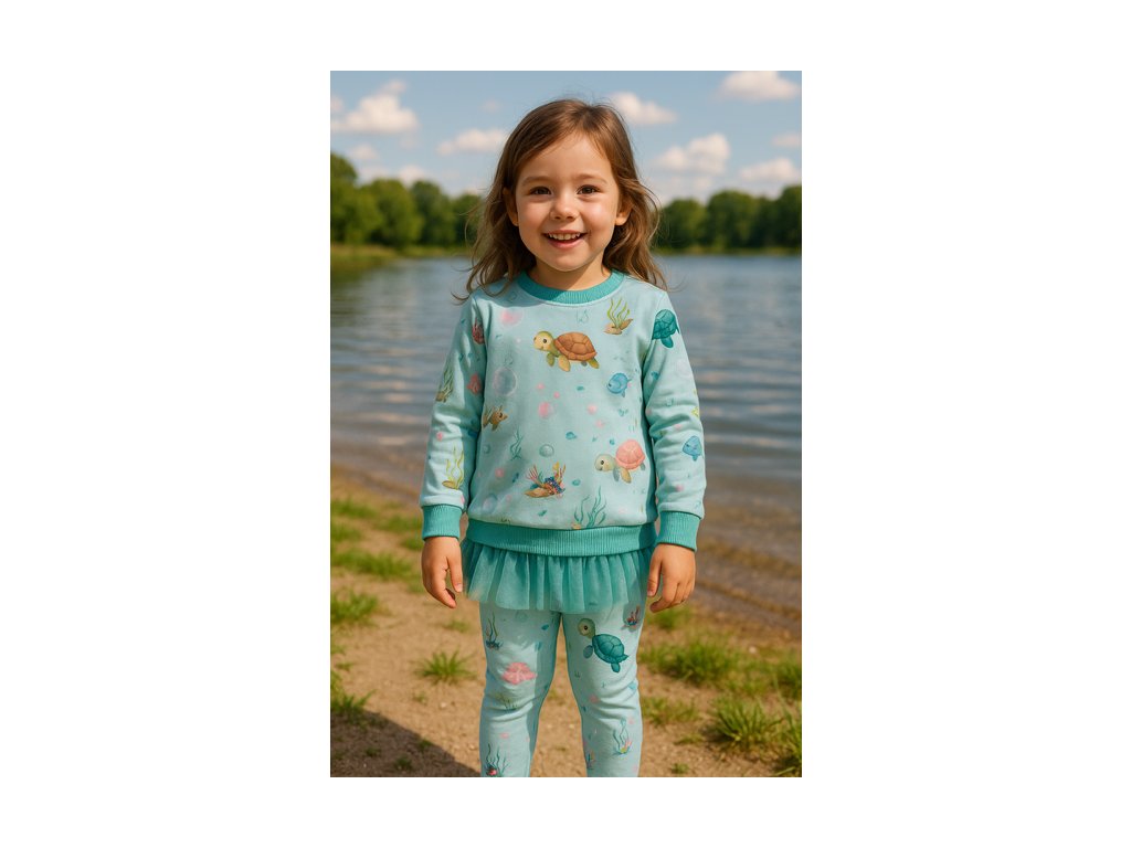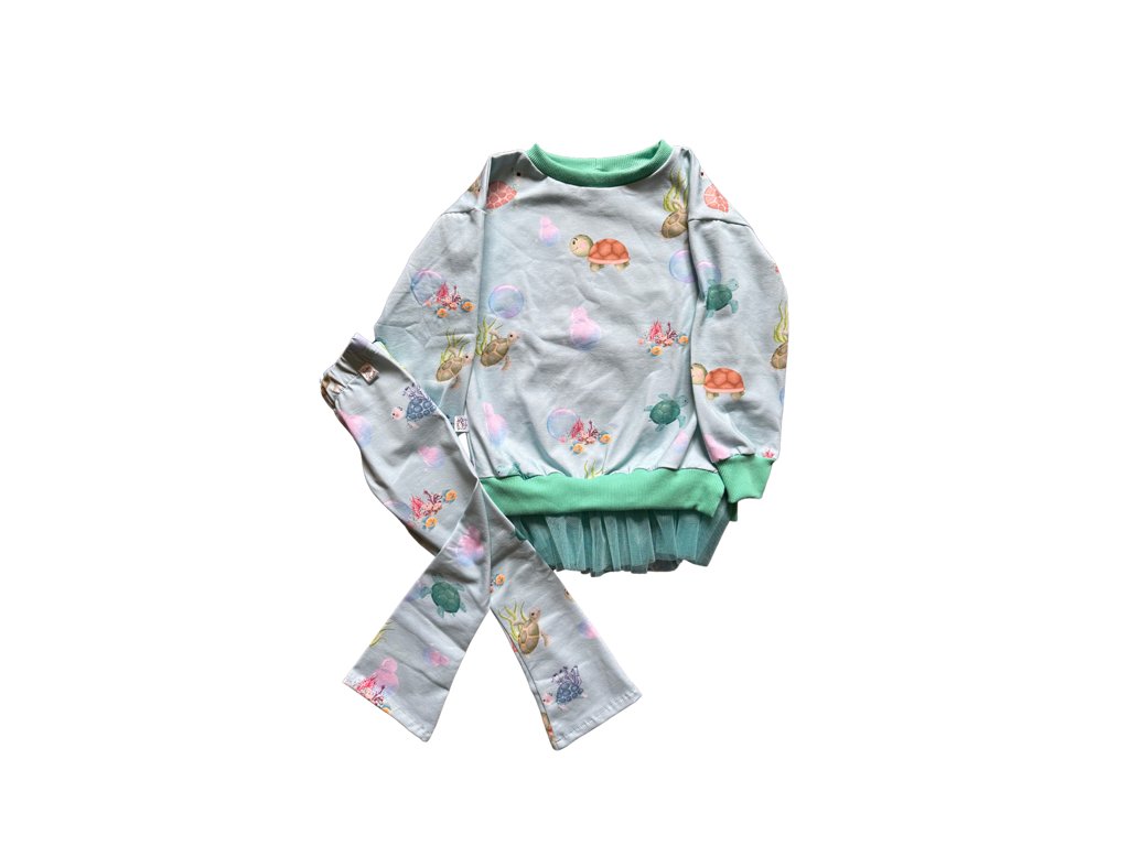 Rozkošná souprava pro malé milovnice zvířátek a fantazie! Mikina s mořskými motivy, jako jsou želvičky, korály a bubliny, je doplněná jemným tylovým volánkem a skvěle ladí se zvonovými legínami ve stejném designu.