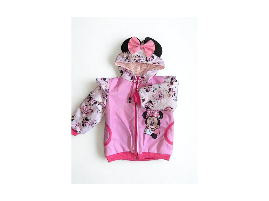 Veselá jarní bunda Minnie s volánky, růžovou mašlí a ušima na kapuci zaujme každou malou holčičku.