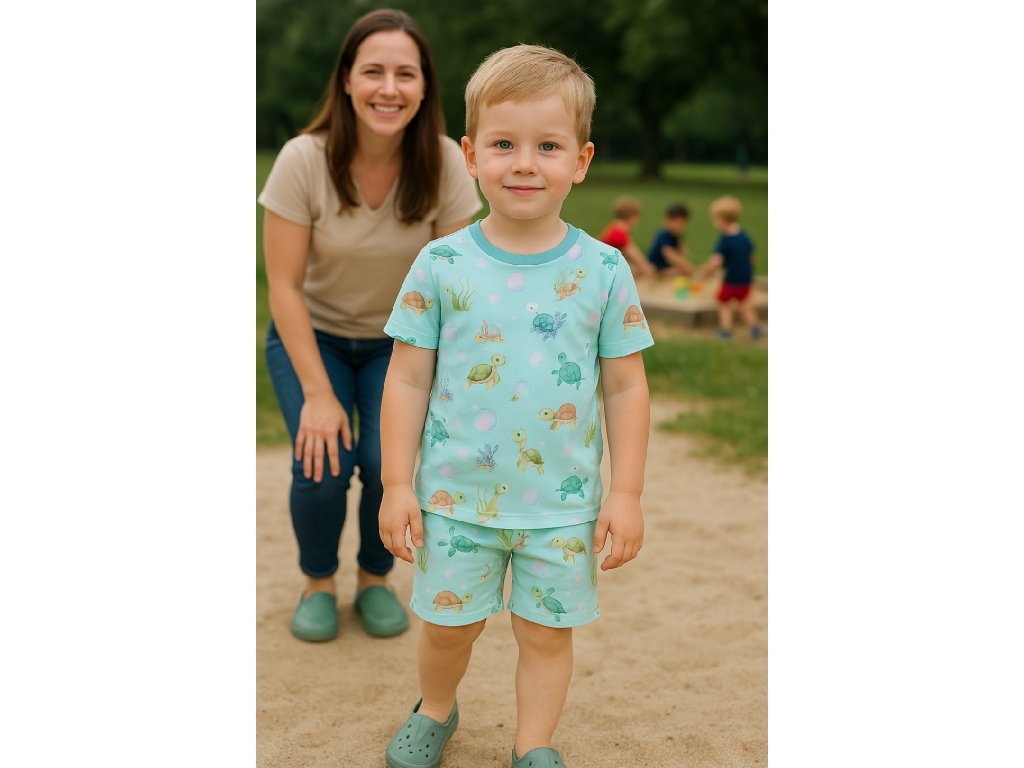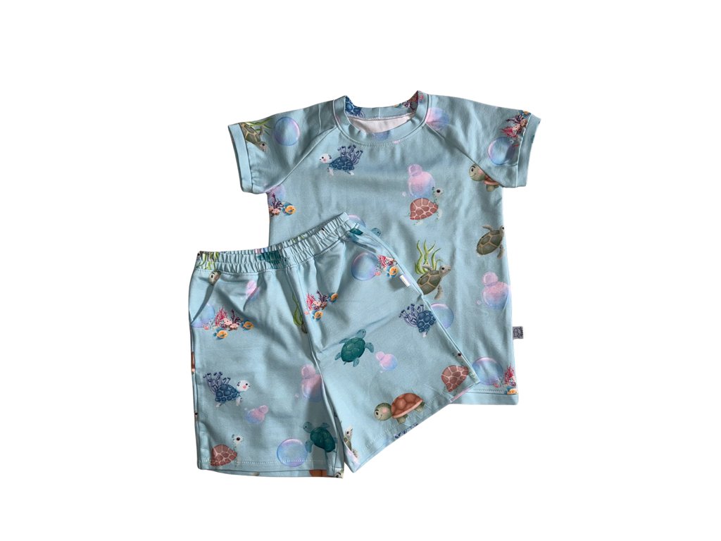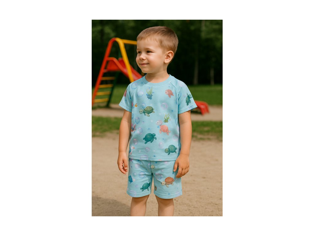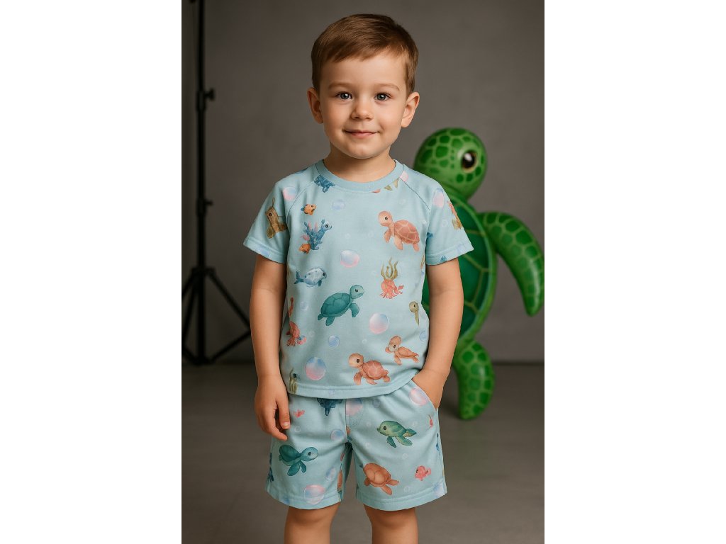 Pohodlný a hravý komplet pro malé dobrodruhy! Lehký jersey set z kvalitní bavlny se skládá z krátkého trička a kraťasů s veselým mořským motivem želviček, bublinek a korálů.