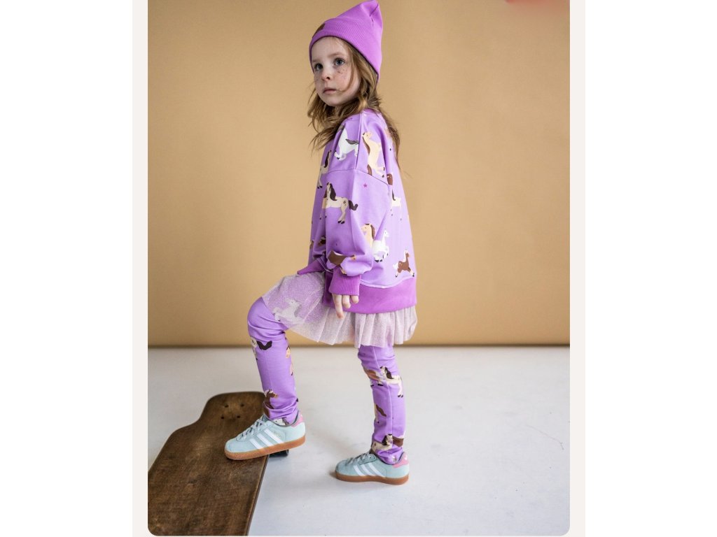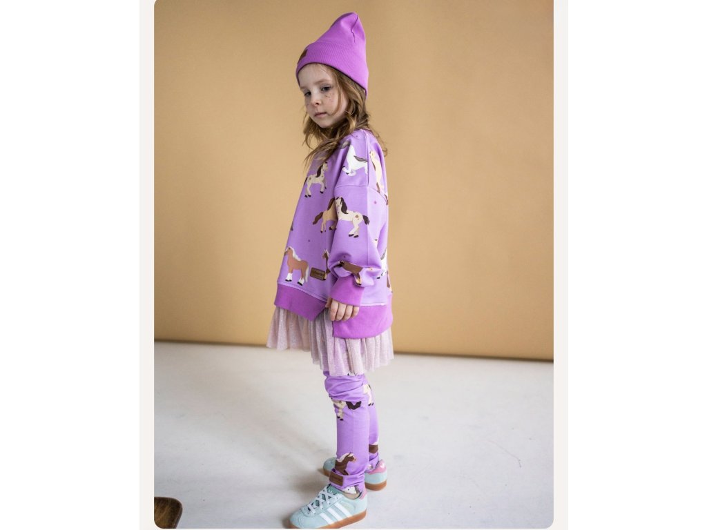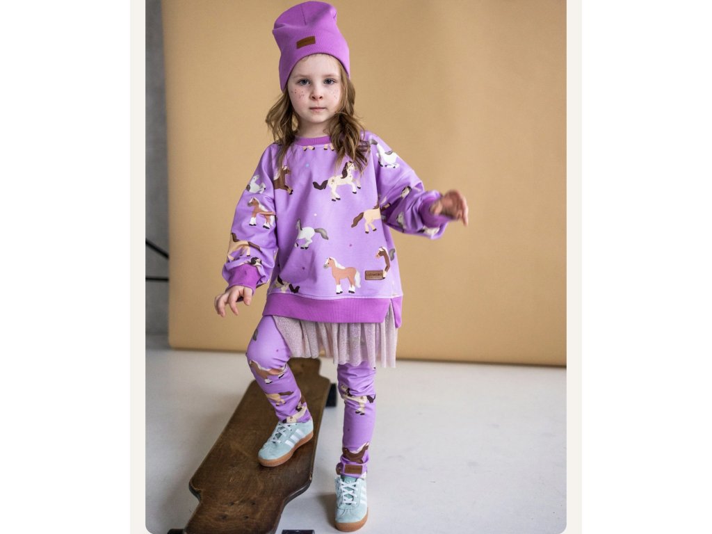 Veselá a pohodlná mikina v jemné fialové barvě potěší každou malou milovnici koní.