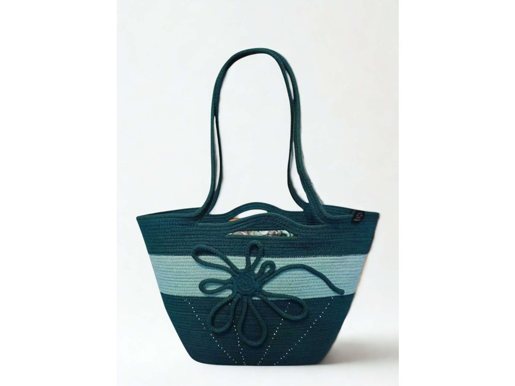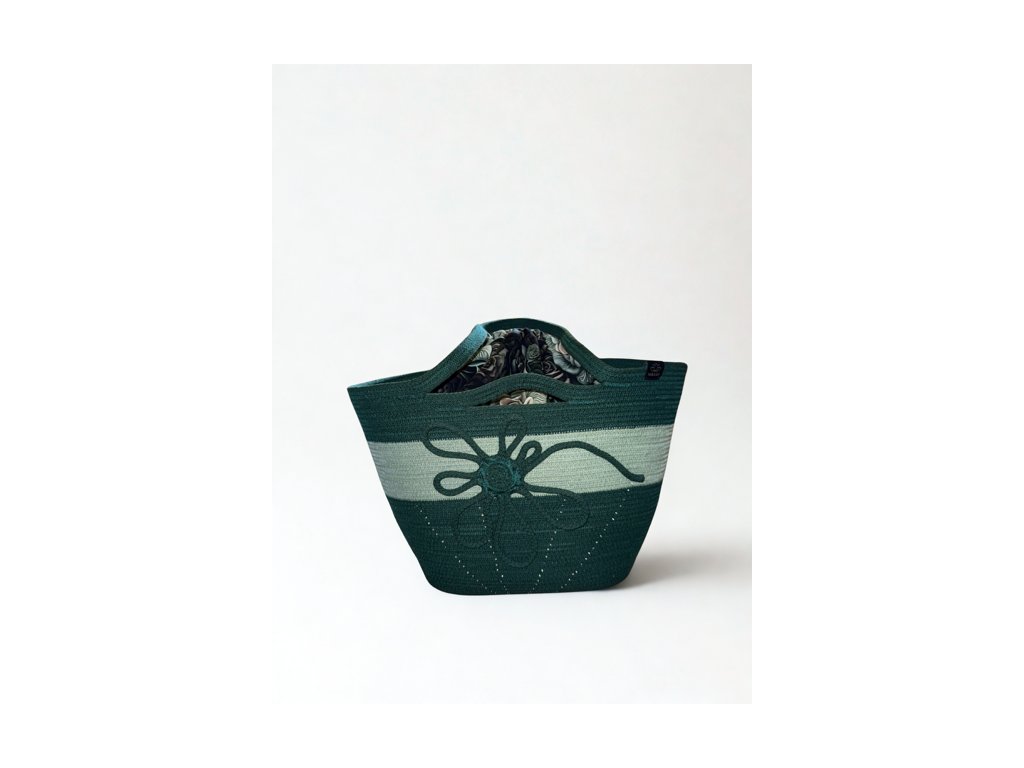 Originální kabelka ručně šitá z pevného provázku v elegantní zelené kombinaci okouzlí svým květinovým vzorem i propracovanými detaily.